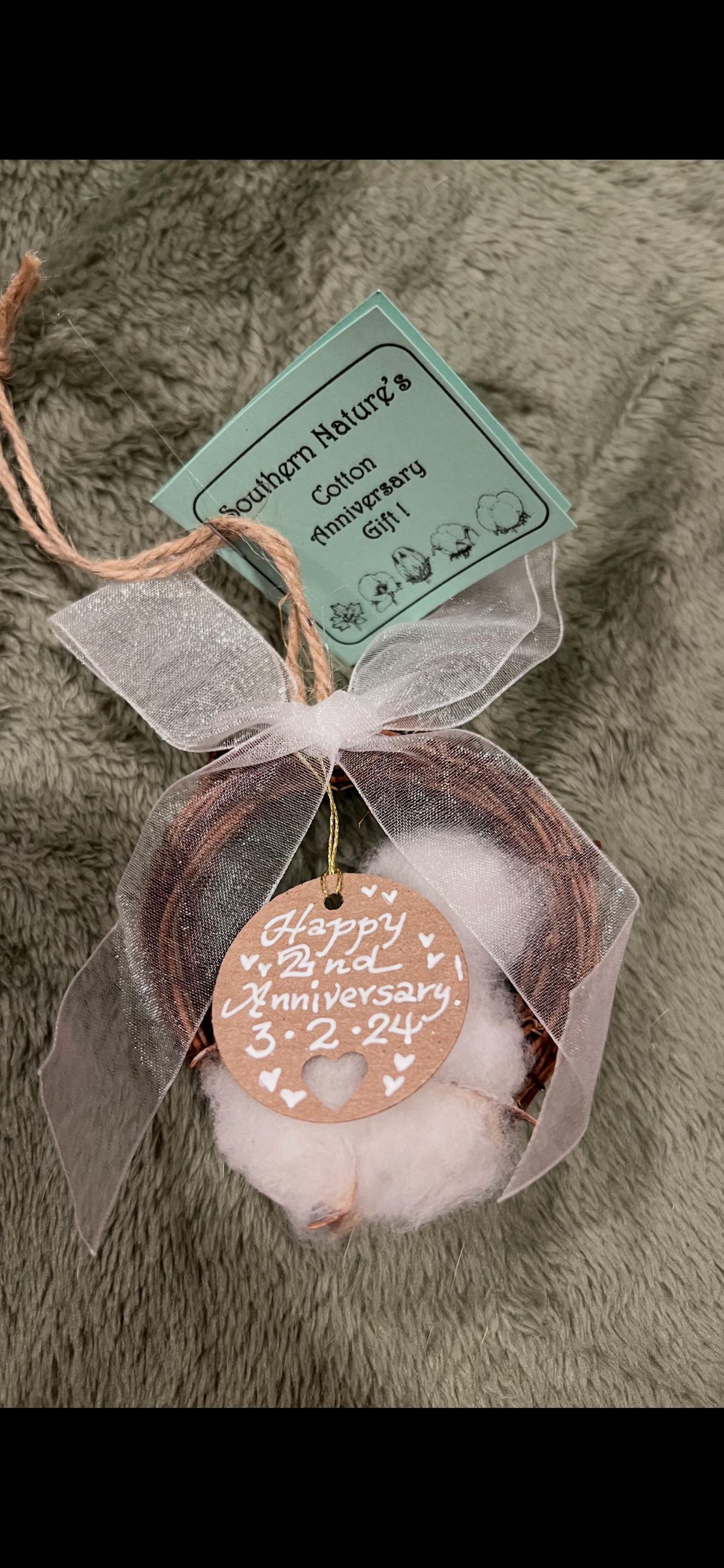 The ornament has a tag with "Happy 2nd Anniversary" on it with an informational tag about cotton attached. The grapevine wreath has a small cotton boll decorated with a white organza bow.