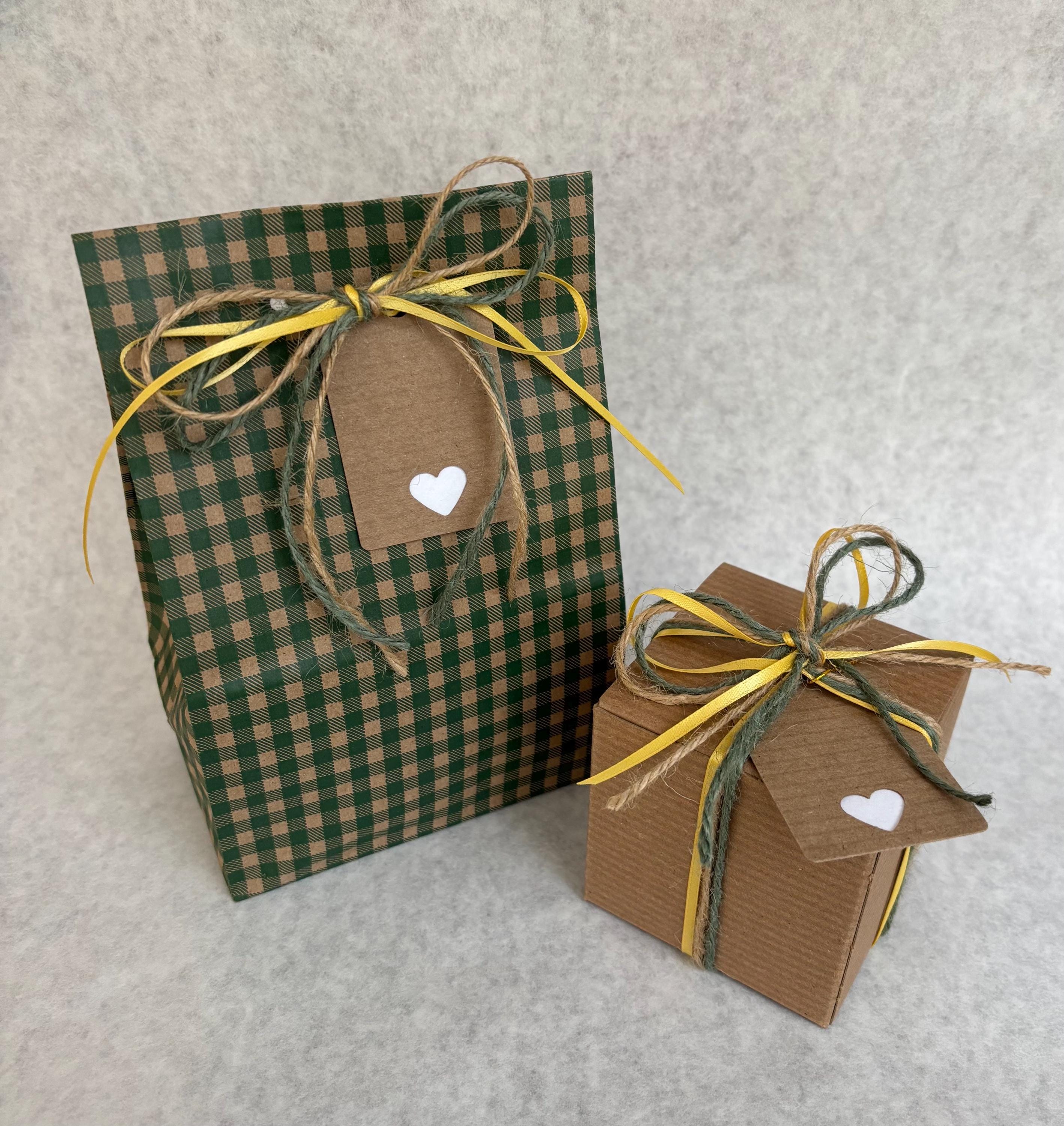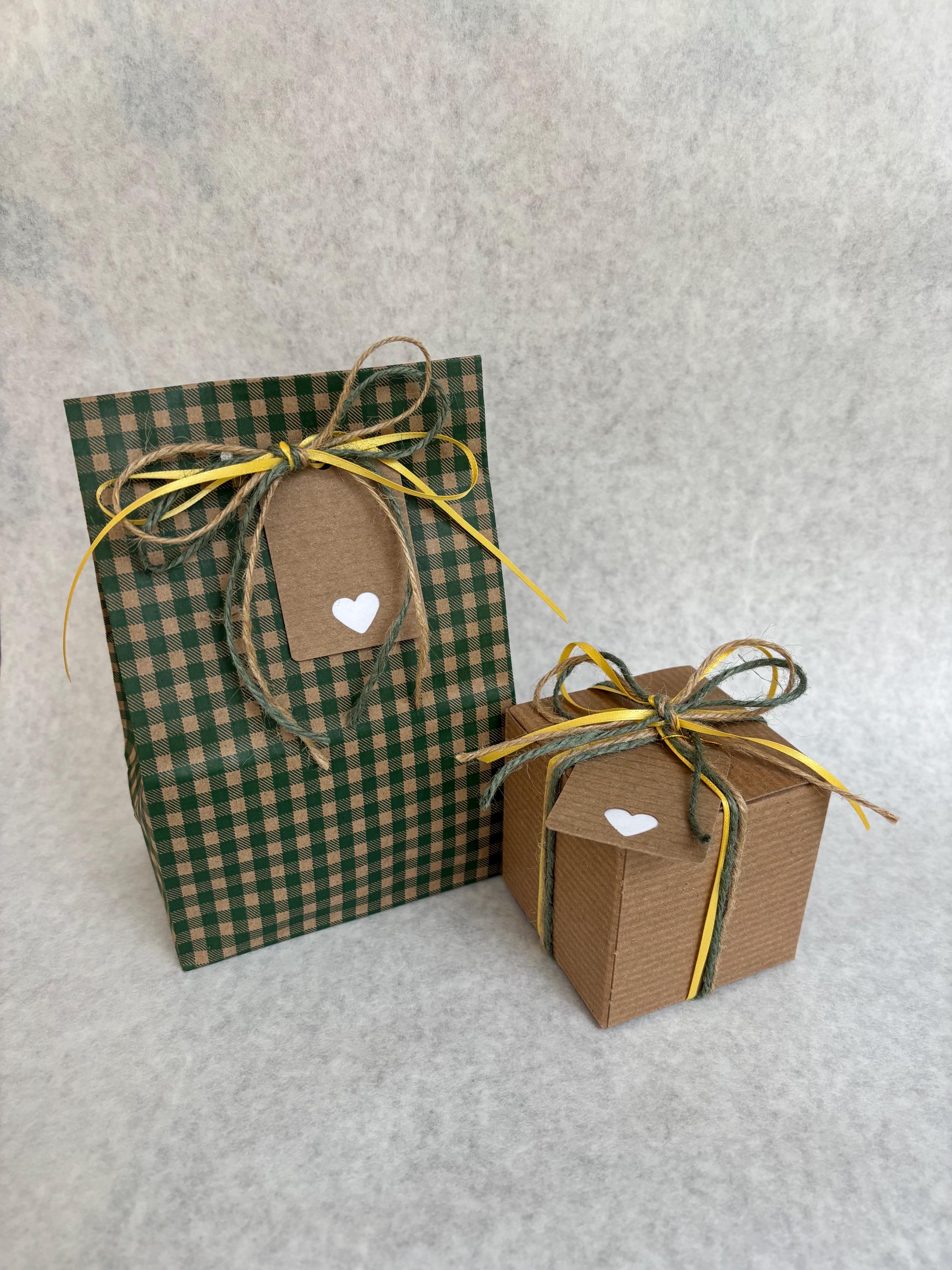 The ornaments can come packaged in a gingham gift bag tied with a colorful jute bow! Or in a gift box with a gift tag. Or without packaging for your own tree!